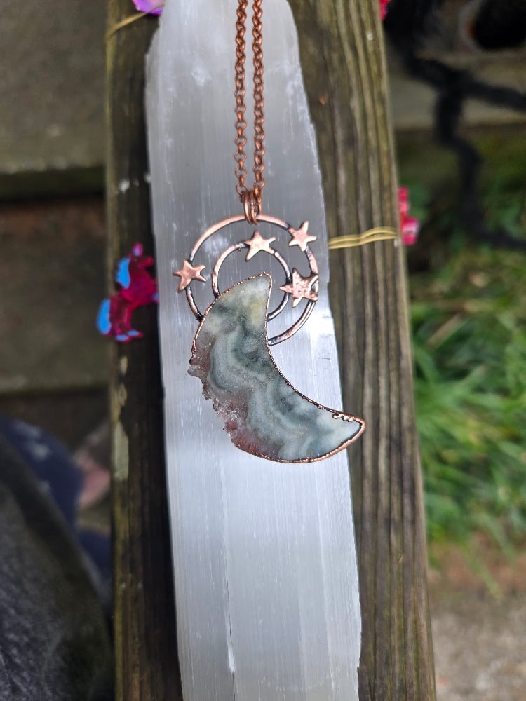 Electroformed Amethyst moon and stars necklace. . This piece comes on an 18-inch copper chain. Please leave me a note at checkout if you would like a different length. Thanks