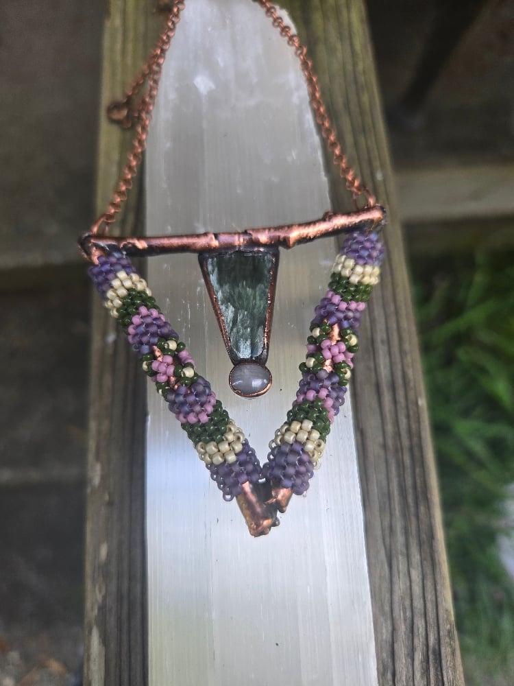 Electroformed and beaded Serephinite, Pink Sapphire, and red cedar necklace. This piece comes on an 18-inch copper chain. Please leave me a note at checkout if you would like a different length. Thanks