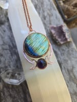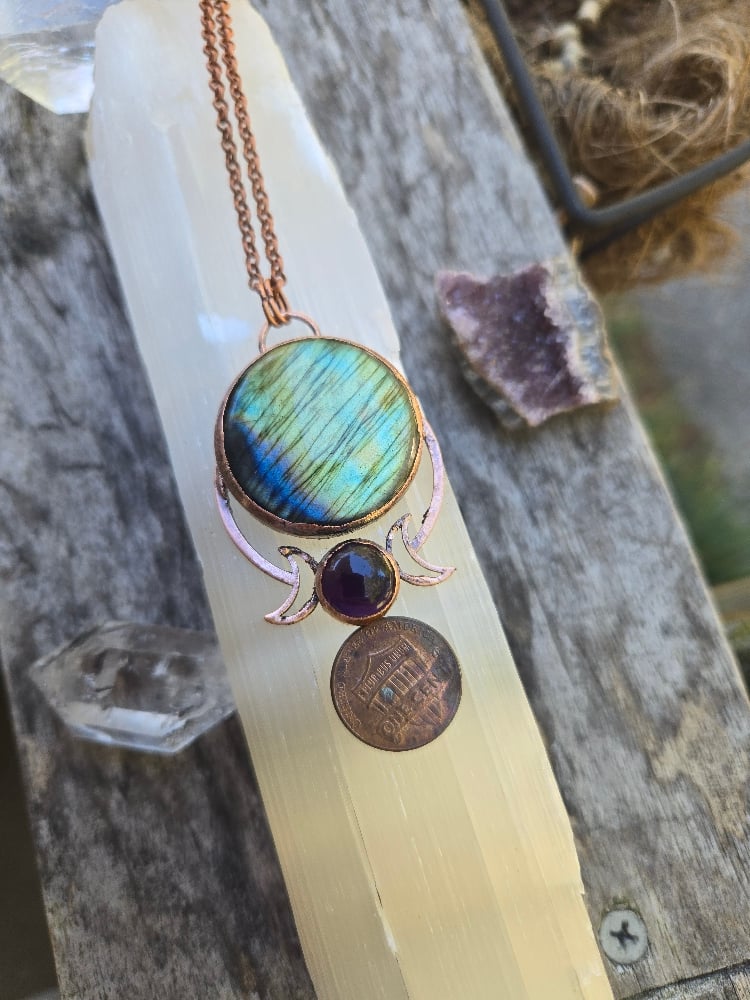 Electroformed labradorite and amethyst moonphase necklace. This piece comes on an 18-inch copper chain. Please leave me a note at checkout if you would like a different length. Thanks