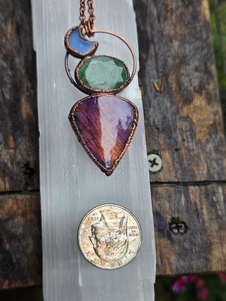 Electroformed labradorite, aquamarine and opalite moon necklace. This piece comes on an 18-inch copper chain. Please leave me a note at checkout if you would like a different length. Thanks
