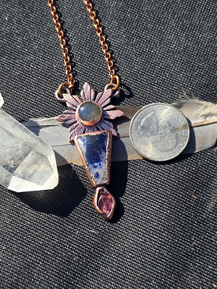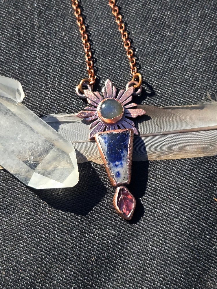 Electroformed labradorite, sodalite and glass leaf sunflower necklace. This piece comes on an 18-inch copper chain. Please leave me a note at checkout if you would like a different length. Thanks