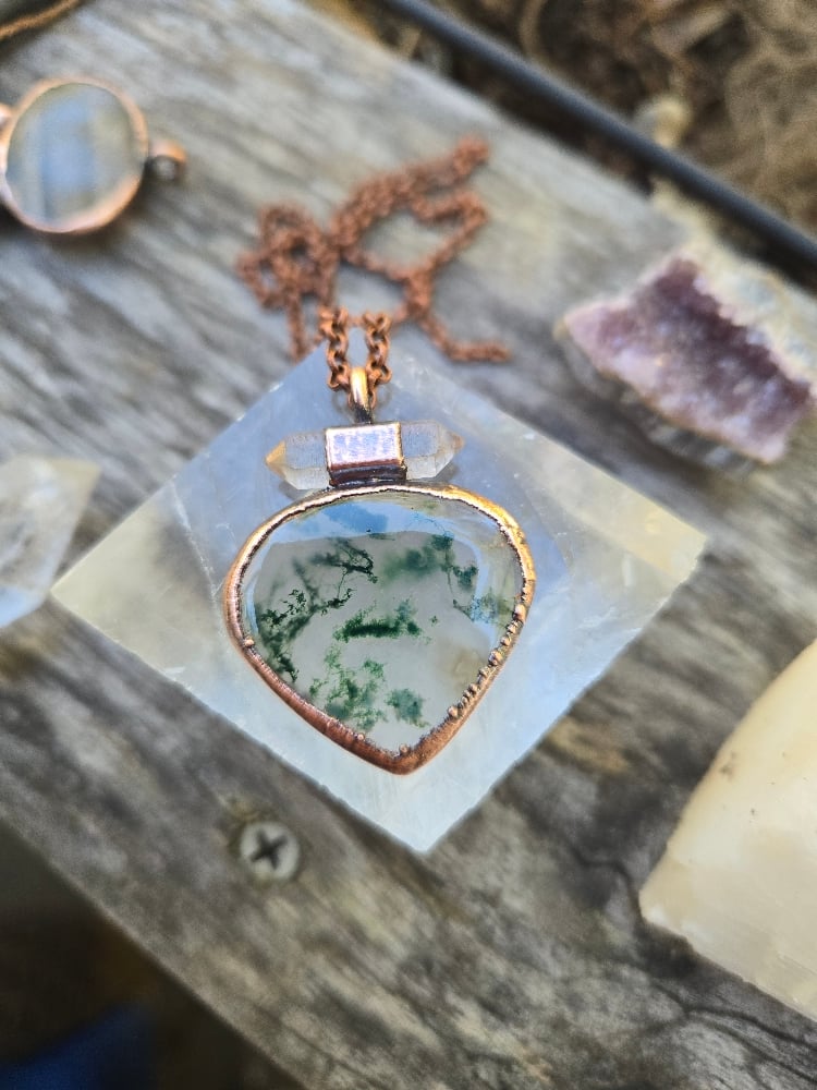 Electroformed Moss Agate and Herkimer diamond necklace. This piece comes on an 18-inch copper chain. Please leave me a note at checkout if you would like a different length. Thanks