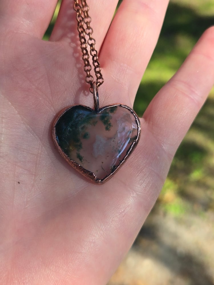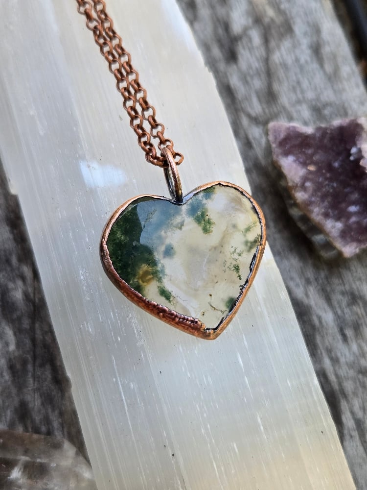 Electroformed moss agate heart necklace. This piece comes on an 18-inch copper chain. Please leave me a note at checkout if you would like a different length. Thanks