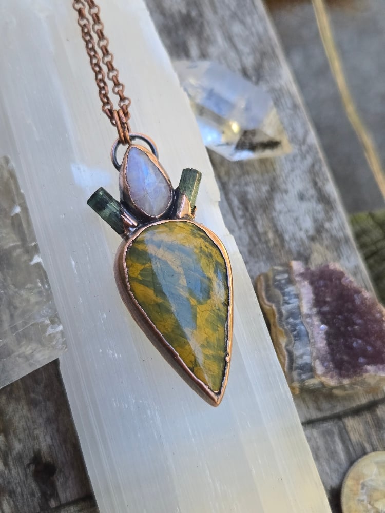 Electroformed nellite, moonstone and indicolite tourmaline necklace. Nellite is a cross between Tigers eye and Pietersite and contains the metaphysical properties of both stones. This piece comes on an 18-inch copper chain. Please leave me a note at checkout if you would like a different length. Thanks