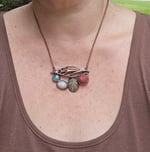 Electroformed Strawberry top shell, green limped shell, moonstone, and amazonite necklace. This piece comes on an 18-inch copper chain. Please leave me a note at checkout if you would like a different length. Thanks