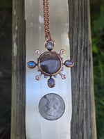 Electroformed labradorite, and moonstone necklace. This piece comes on an 18-inch copper chain. Please leave me a note at checkout if you would like a different length. Thanks