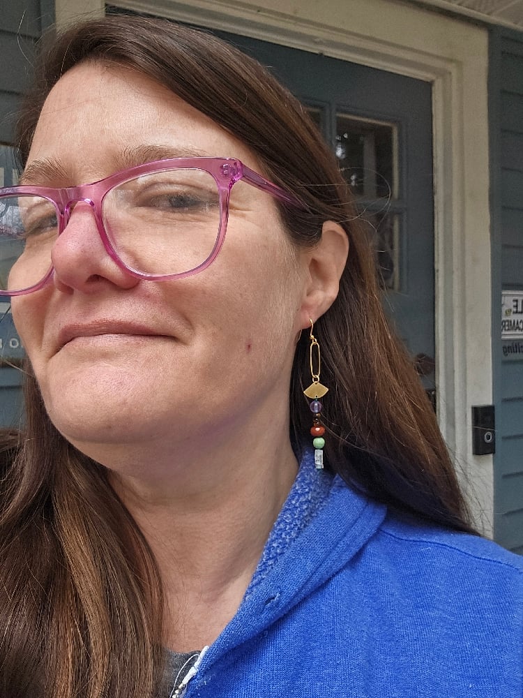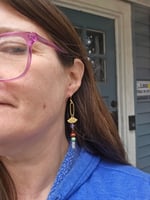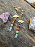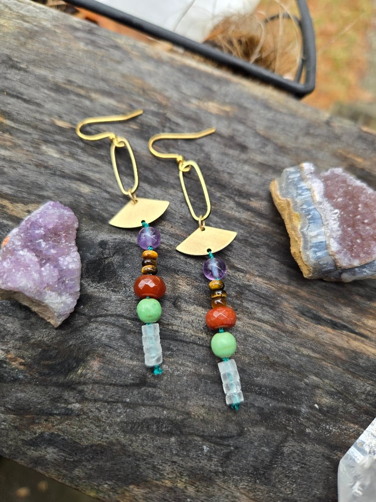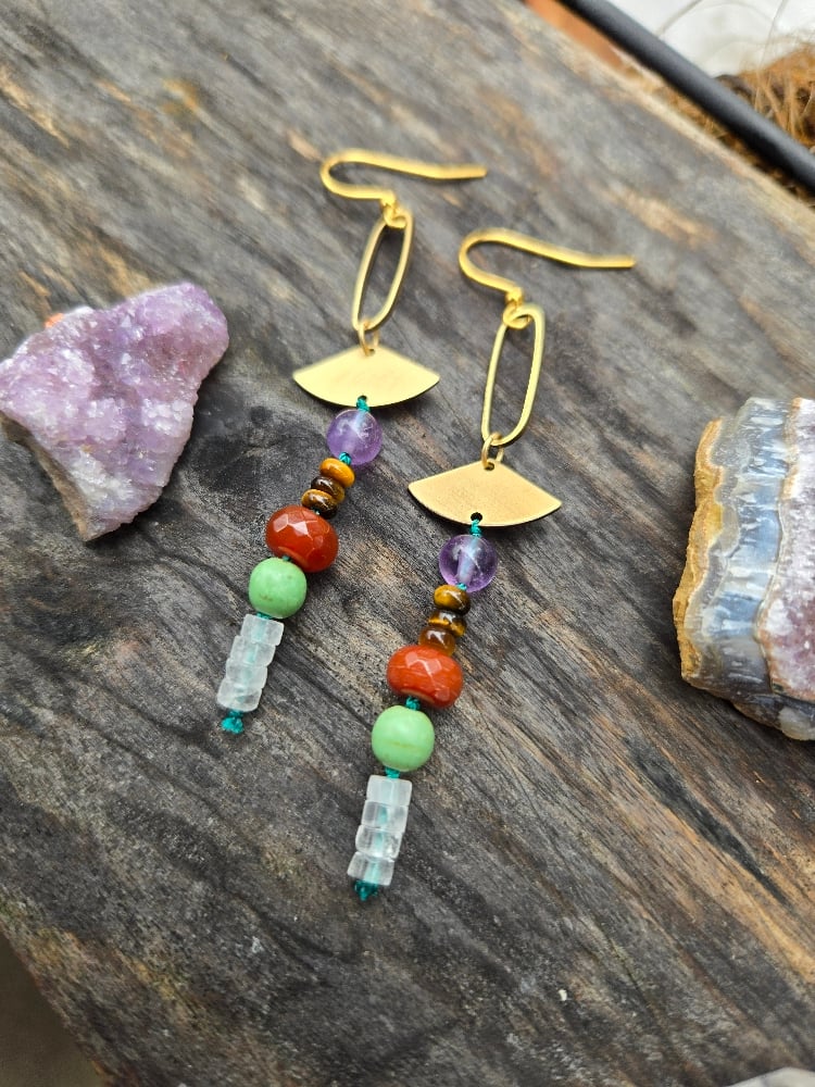 Knotted gemstone and brass earrings. These earrings contain amethyst, tiger's eye, carnelian, turquoise and quartz.. They come on gold plated earwires.