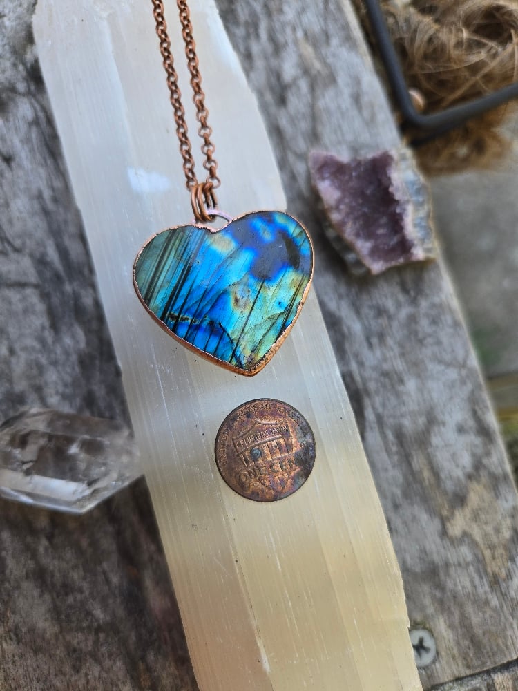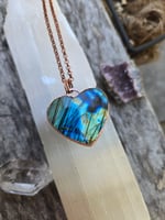 Electroformed labradorite heart necklace. This piece comes on an 18-inch copper chain. Please leave me a note at checkout if you would like a different length. Thanks