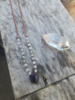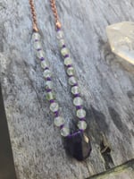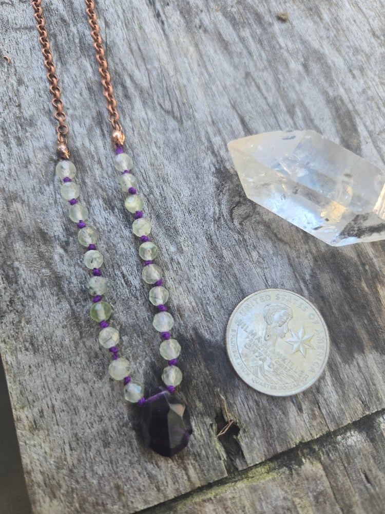 Prehnite and Amethyst knotted necklace. It's knotted on purple cord and is 18 inches long. I can make it longer or shorter. Please leave me a note at check out to let me know what length you would like.
